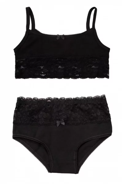 Нежный однотонный комплект белья для девочки и девочки подростка выполнен из натурального хлопка с эластаном. Бельевой комплект черного цвета комфортно носить под любую одежду круглый год. В наборе майка топ для девочек и трусы в черном цвете. Комплект украшен эластичным и кружевом.