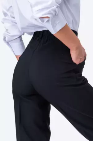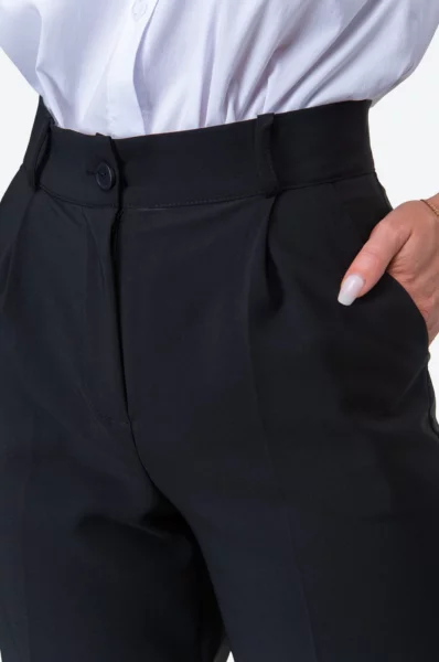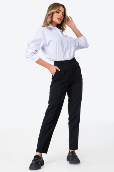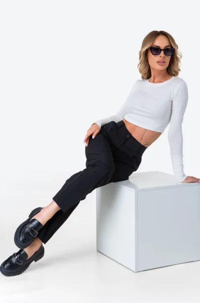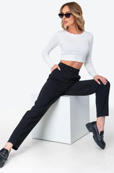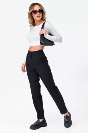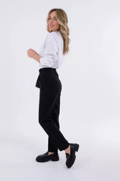 Женские укороченные брюки созданы для тех, кто ценит элегантность. Чёрные брюки бананы со стрелками визуально вытягивают силуэт и подчёркивают талию, оставаясь при этом удобными.