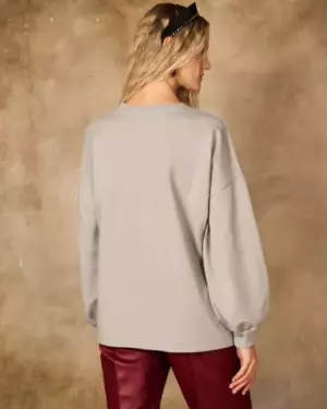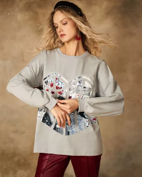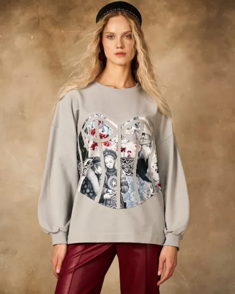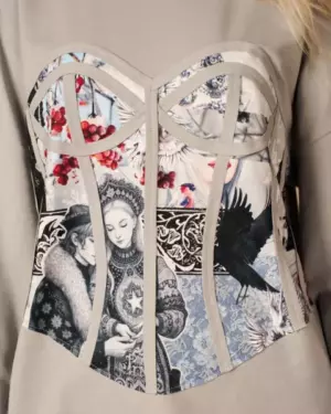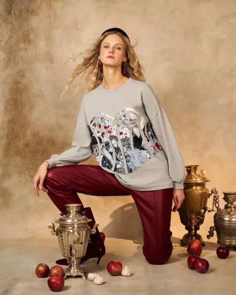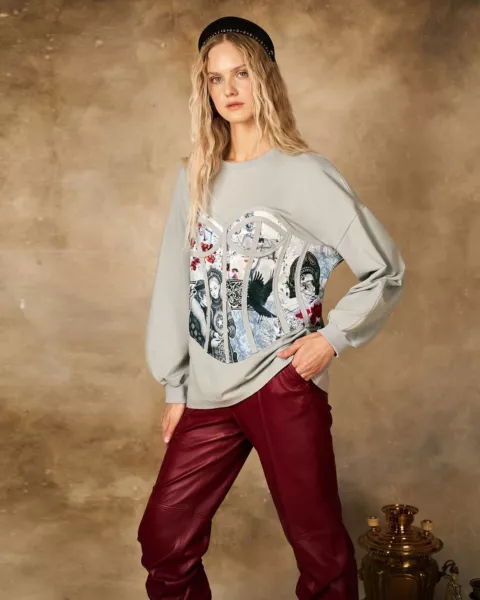 Cвитшот с имитацией корсета. Свитшот имеет свободный крой, что делает его комфортным и универсальным для различных образов. Длинные рукава с манжетами придают аккуратный и завершенный вид. Декоративные элементы на груди и талии подчеркивают фигуру, добавляя элегантности.