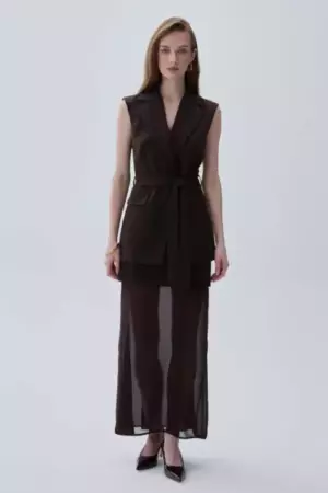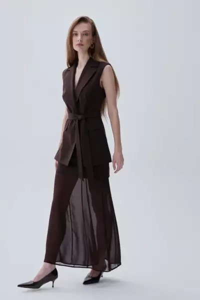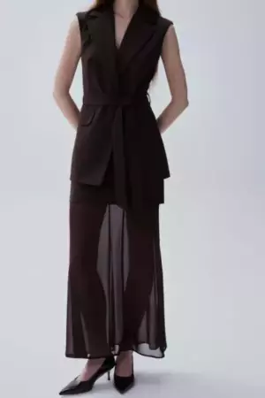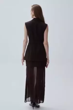Трендовая юбка из комбинации костюмного полотна и шифона. Модель А-силуэта, по талии на обтачке, застежка на потайную молнию.