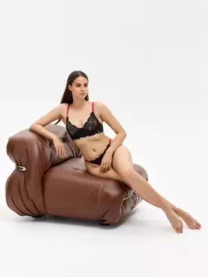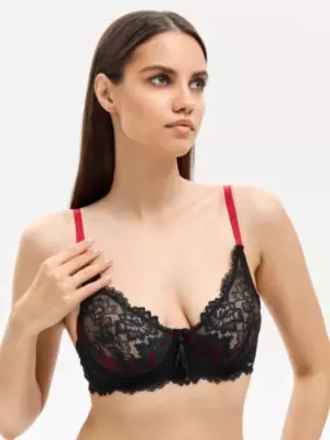 Трусики модели Brazilian с низкой линией талии выполнены из нежного кружева черного цвета с контрастной подкладкой вишневого цвета в передней части и контрастной резинкой с возможностью регулирования по бокам. Задняя часть трусиков выполнена из черного кружева с фестонами по срезам ножек и украшена металлическим шильдиком с наименованием бренда. Ластовица из хлопка. Размерная сетка XS-(90), S-(94), M-(98), L-(102), XL-(106). 90%Polyamide/10%Elastane