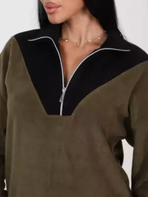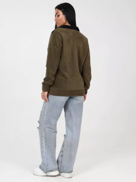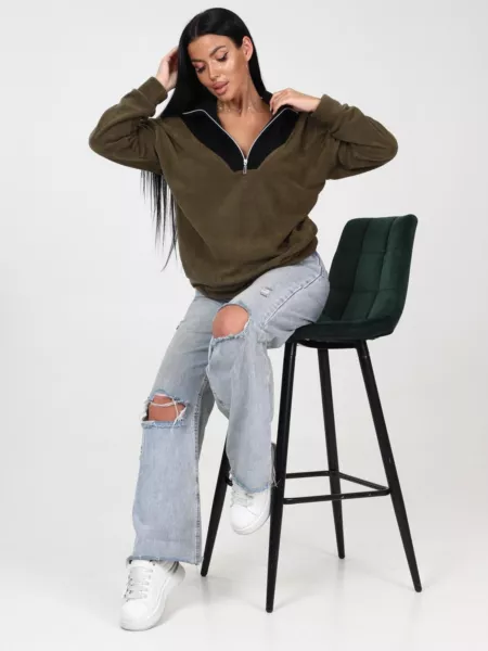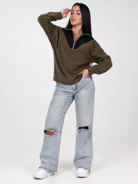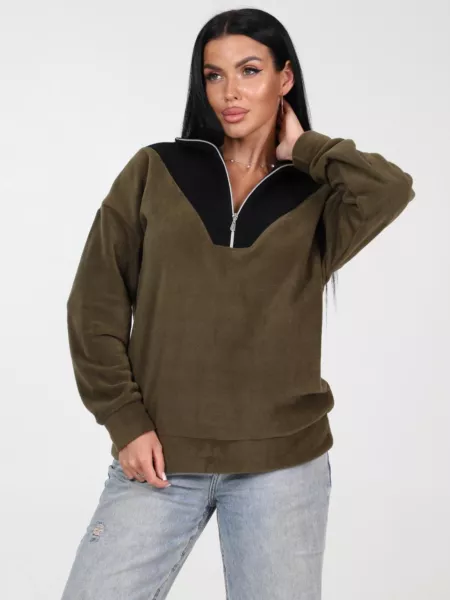 Женская толстовка выполнена из трикотажного полотна "флис". Толстовка свободная, со спущенным плечом, рукава на манжетах, низ толстовки на поясе, воротник и двойная кокетка на молнии и выполнены из флиса контрастного цвета._x000D_