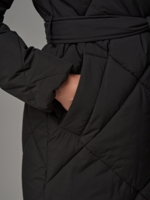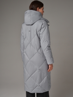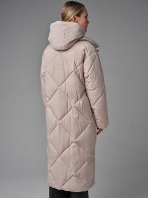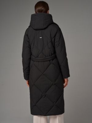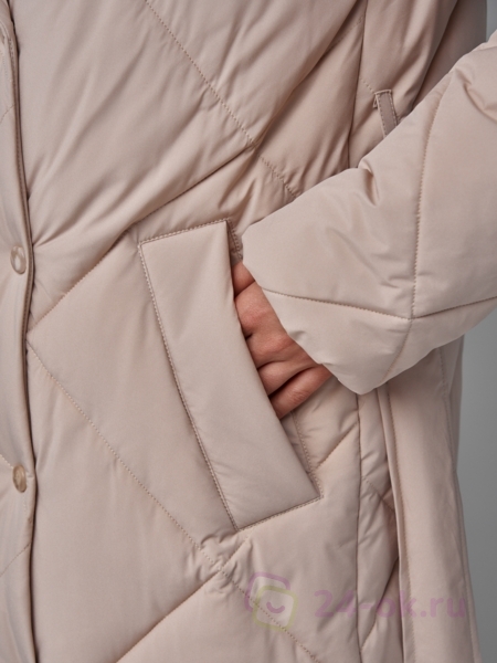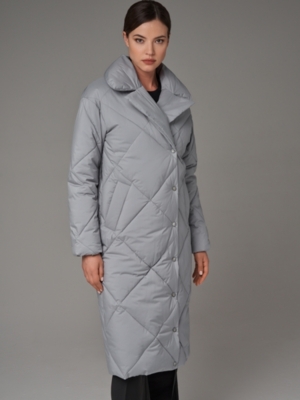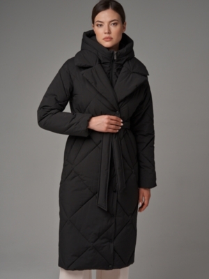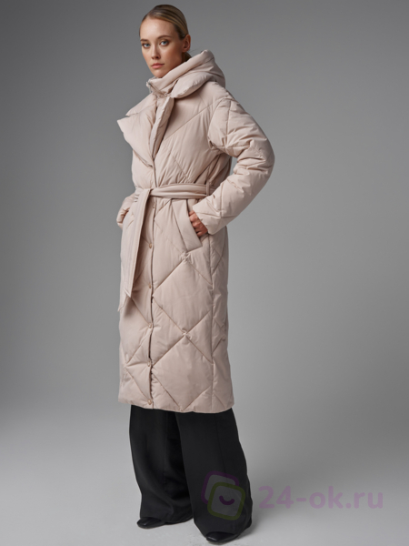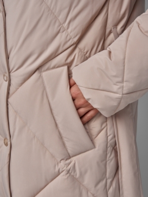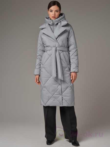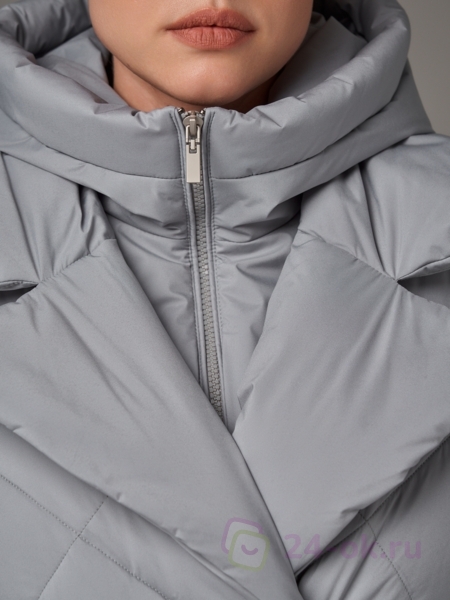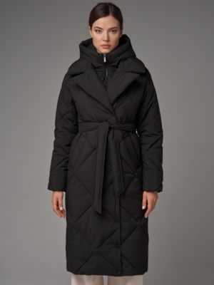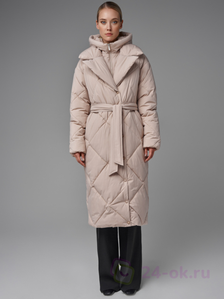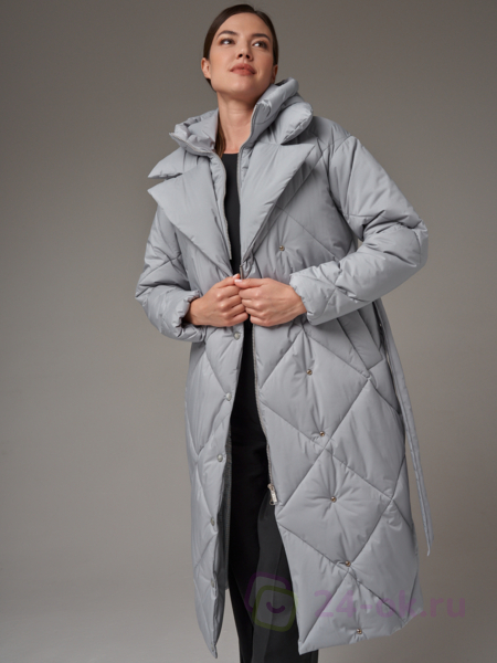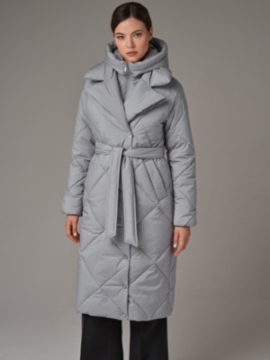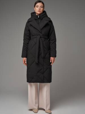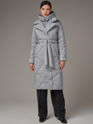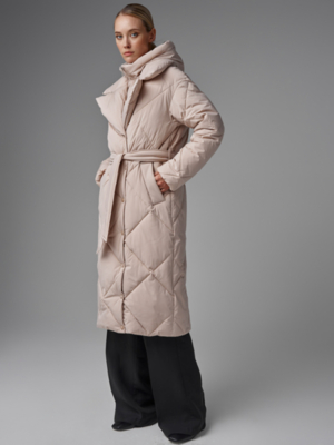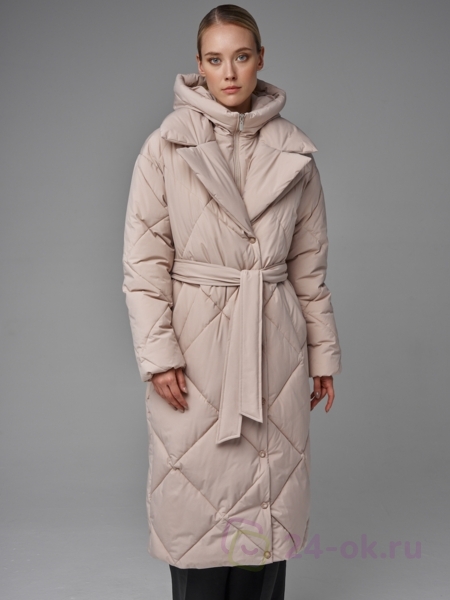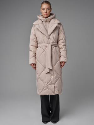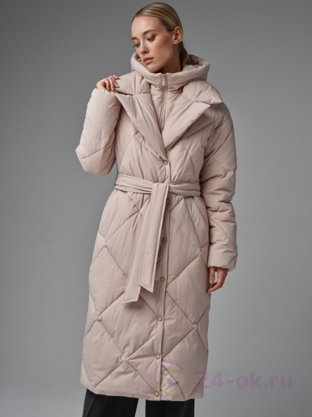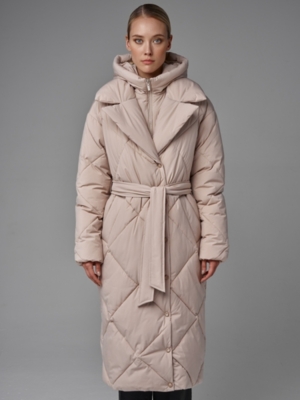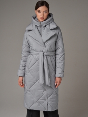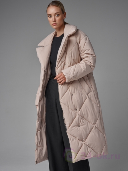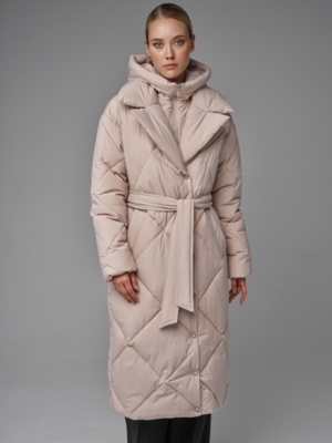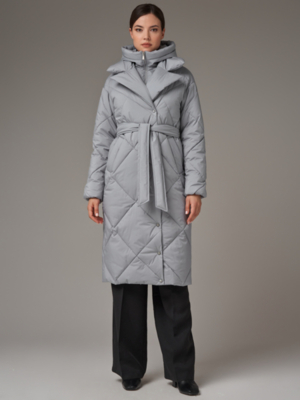 Двубортный пуховик прямого силуэта со съемным капюшоном, который крепится на потайные кнопки. Горловина изделия оформлена воротником с лацканами. Рукав со спущенным плечом. По низу рукава идет внутренняя ветрозащитная утяжка на резинке. Застежка на молнию и кнопки в тон изделия. В плаще имеются два кармана с листочками на магнитах и один внутренний карман. В комплекте с изделием идет пояс из основной ткани. Ткань плащевая с водоотталкивающей пропиткой. Утепление Био пух 250 гр. Рекомендуемый температурный режим (от 0°С до -20°С). Длина изделия: 115 см Длина рукава: 64 см.