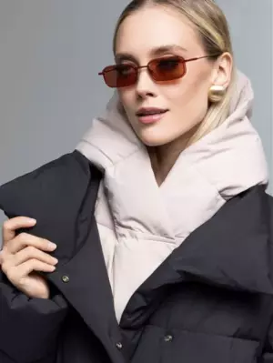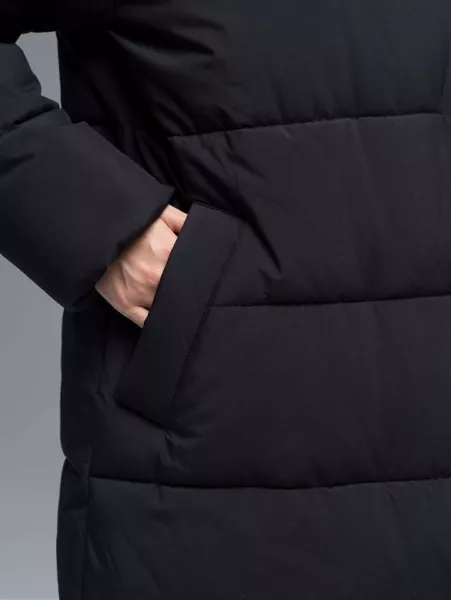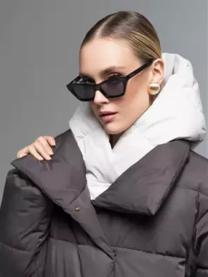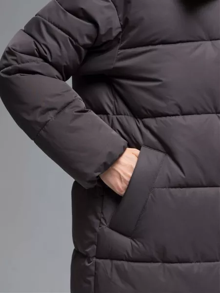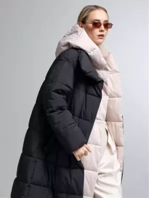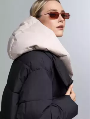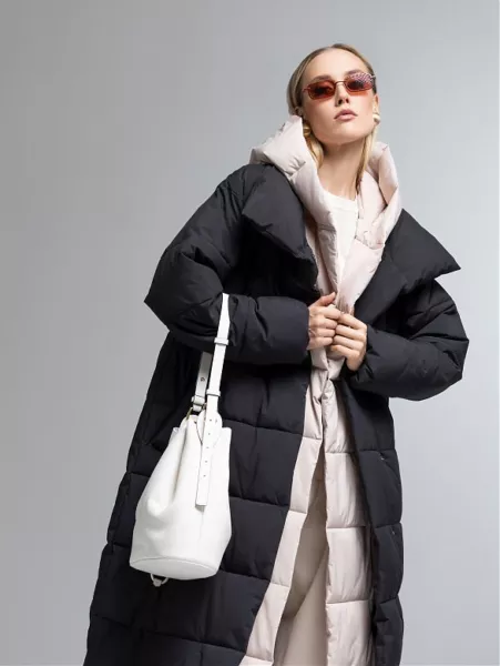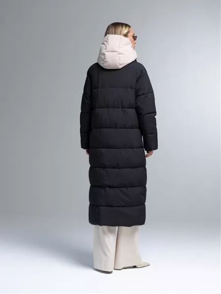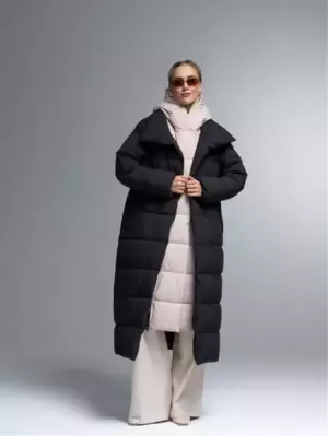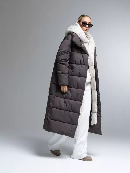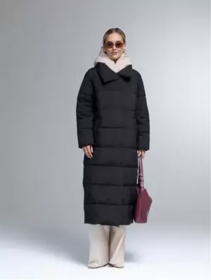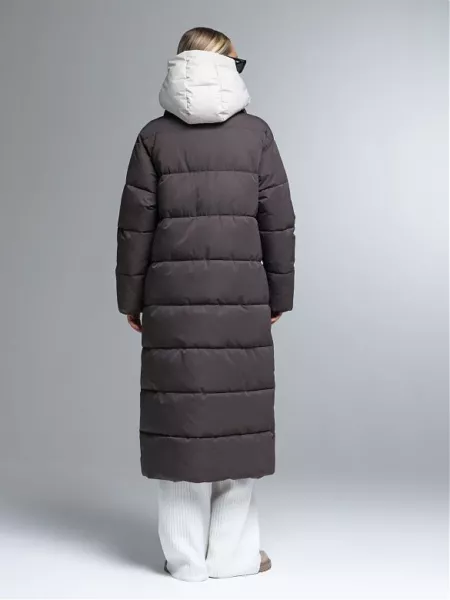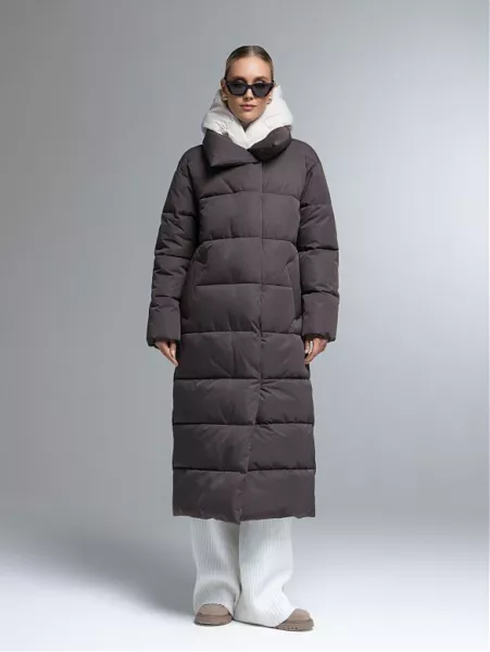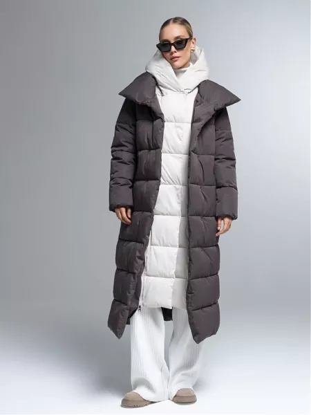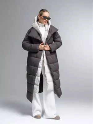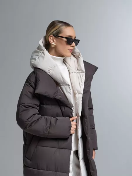 Пуховик с контрастной отстежной манишкой. Застежка на потайные кнопки. Манишка и стойка застегиваются на магниты.