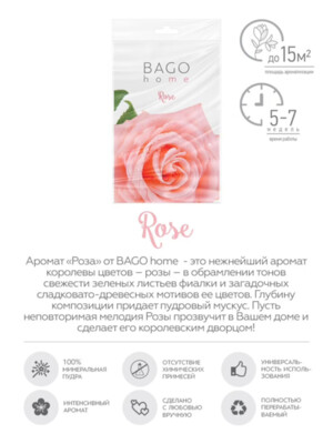«Роза» от BAGO home – это нежнейший аромат королевы цветов – розы – в обрамлении тонов свежести зеленых листьев фиалки и загадочных сладковато-древесных мотивов ее цветов. Глубину композиции придает пудровый мускус. Пусть неповторимая мелодия Розы прозвучит в Вашем доме и сделает его королевским дворцом!