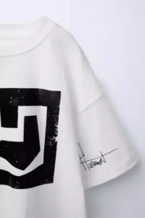 Футболка с круглым вырезом и короткими рукавами. Печать спереди и граффити на рукаве. ДЕРГАЛА ДЕТАЛИ НА ОЗНАЙТЕ.
