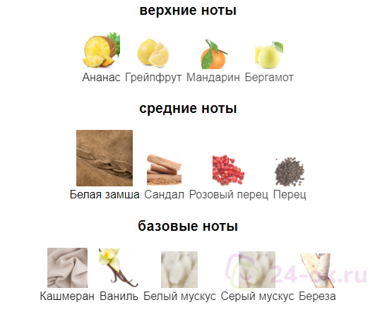 Верхние ноты: ананас , бергамот , грейпфрут , мандарин