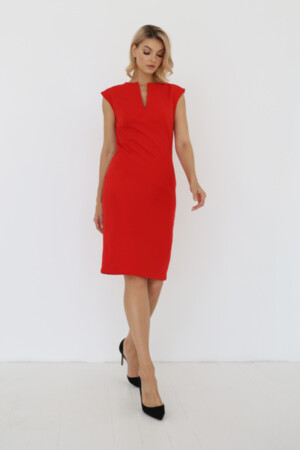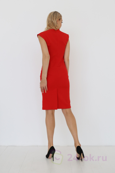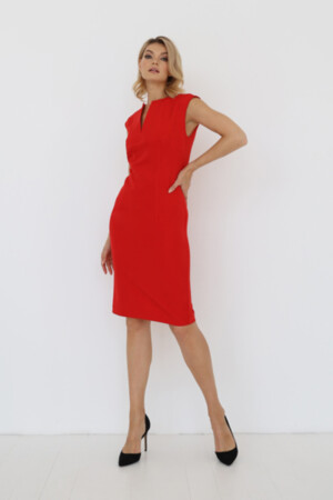 Платье-футляр без рукавов с круглой горловиной, кокеткой и разрезом по переду, шлицей и застежкой на молнию в среднем шве спинки.