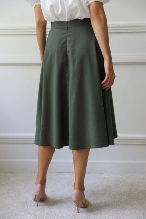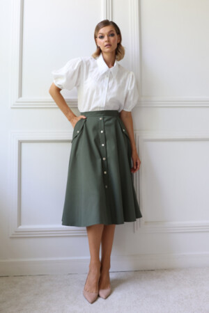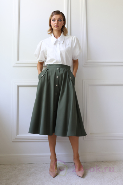 Юбка-трапецияна пуговицах. Карманы с клапанами и фурнитурой в боковых швах изделия. Застёжка- молния сзади. Изделие выполнено без подкладки.