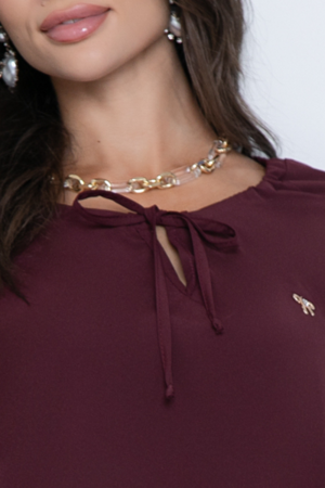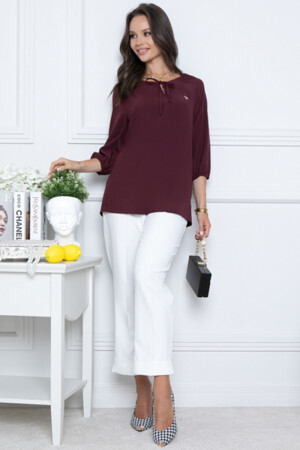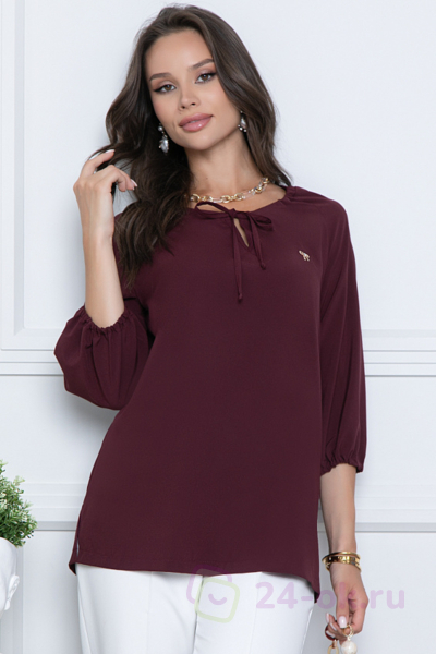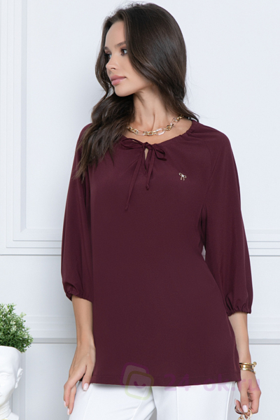 Луина – блузка свободного силуэта из легкой блузочной ткани. Вырез горловины на сборке и на завязке. Рукава 3/4, реглан, внизу оторочены резинками. По бокам на блузке разрезы. Элегантная блузка органично впишется в деловой и повседневный гардероб. Она отлично смотрится с прямыми брюками, джинсами, шортами. Для создания более женственного образа блузку можно надеть с узкой юбкой. Выбор обуви зависит от стиля созданного комплекта: это могут быть туфли на высоком каблуке или лоферы, ботильоны или босоножки.