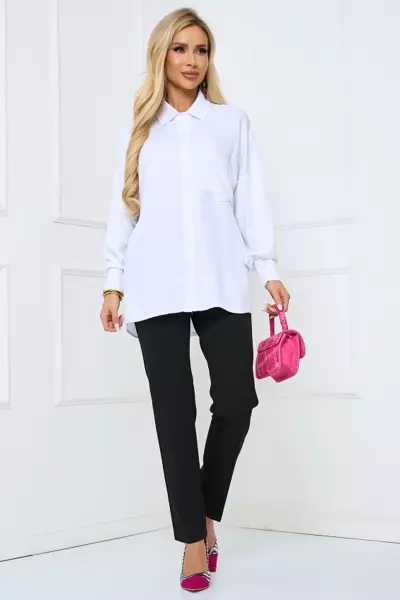Кутро – блузка-рубашка свободного кроя из хлопковой ткани. Вырез горловины классический округлый с отложным воротничком. Рукава длинные со спущенным плечом, отороченные манжетами с функциональными пуговицами. Спереди планка с функциональными пуговицами. На груди накладной карман. Данная модель блузки-рубашки за счет своей универсальности сочетается с вещами разных стилей: джинсами, классическими брюками, пиджаками, кардиганами.