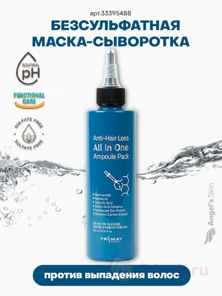 Ампульная маска против выпадения волос с комплексом аминокислот и протеинов интенсивно оздоравливает волосы, в короткие сроки устраняет сухость, ломкость, препятствует сечению и выпадению, делает волосы гладкими и послушными. Уже с первого применения маска возвращая им ухоженный вид и живой блеск. Ампульная маска питает волосы от корней до кончиков! Благодаря супер концентрированному составу, богатому эффективными ухаживающими компонентами, средство делает волосы живыми, блестящими и ухоженными. Маска активно укрепляет пряди, делает их более мягкими и послушными, контролируя при этом баланс влаги в самих волосах и в кожном покрове головы. Тщательно разработанная формула действует как лечебное средство для ослабленных волос, предотвращая их выпадение и способствуя их укреплению. Продукт помогает увеличить густоту волос, стимулирует кровообращение в коже головы, что способствует здоровью волос от корней до кончиков. Состав маски обогащён активами, действие которых направлено на улучшение структуры повреждённых волос и улучшению состояния кожи головы. За счёт качественной работы протеинов и аминокислот средство делает волосы ухоженными, здоровыми и блестящими. Ампульная маска от Trimay комплексно решает проблемы волос и кожи головы: - Комплекс аминокислот и витаминов работает над восполнением дефицитов питания волосяных фолликулов. - Обладает мощным тонизирующим эффектом и стимулирует деление клеток. - Устраняет сухость и препятствует потере влаги. - Укрепляет структуру, повышает блеск и эластичность волос. - Очищает поверхность головы, бережно отшелушивает ороговевший слой, устраняет зуд и неприятные ощущения. - Проводит влагу и полезные микроэлементы в глубокие слои дермы, улучшает микроциркуляцию и обеспечивает приток питательных веществ к корням волос. - Глубоко питает, заживляет поврежденные участки, делает волос более плотным и устойчивым к внешнему воздействию. Основные компоненты: 20 аминокислот: создают влагоудерживающий барьер, насыщают волосы влагой, укрепляют их и предотвращают выпадение. 9 гидролизированных протеинов: восстанавливают структуру волос, улучшают блеск, эластичность и защищают от повреждений. - Гидролизованный соевый протеин**: увлажняет, кондиционирует и придает эластичность. - Гидролизованный эксентин**: укрепляет защитный барьер и увлажняет. - Гидролизованный рисовый протеин**: повышает увлажнение и эластичность. - Гидролизованный кукурузный протеин**: покрывает и кондиционирует волосы. - Гидролизованный картофельный протеин восстанавливает поврежденные волосы. - Гидролизованный протеин ячменя питает и увлажняет. - Гидролизованный протеин овса защищает и увлажняет. - Гидролизованный коллаген увлажняет и кондиционирует. - Гидролизованный кератин кондиционирует и защищает. 4 пептида восстанавливают волосы, укрепляют корни и защищают от выпадения. 8 видов гиалуроновой кислоты интенсивно увлажняют и создают влагоудерживающий барьер. Derbiome Cosmocos Scalp Microbiome Solution питает волосяные луковицы и стимулирует их рост. Салициловая кислота очищает кожу головы и контролирует себум. Декспантенол способствует росту волос и увлажняет кожу. Ниацинамид питает луковицы и улучшает микроциркуляцию. Кофеин стимулирует волосяные фолликулы и ускоряет рост волос. Не содержит сульфаты и силикон. Гипоалле