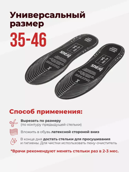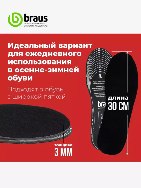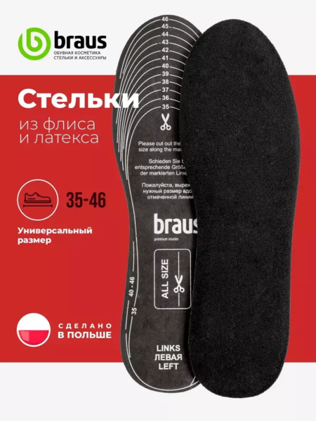 BRAUS Стельки осенне-зимние POLAR BLACK (утепленная флисовая ткань+латекс) БЕЗРАЗМЕРНЫЕ