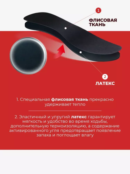 - Специальная флисовая ткань прекрасно удерживает тепло, активированный уголь эффективно и надолго поглощает запах. Эластичный и упругий латекс гарантирует мягкость и удобство во время ходьбы, а так же дополнительную термоизоляцию.