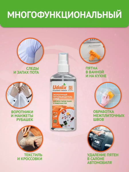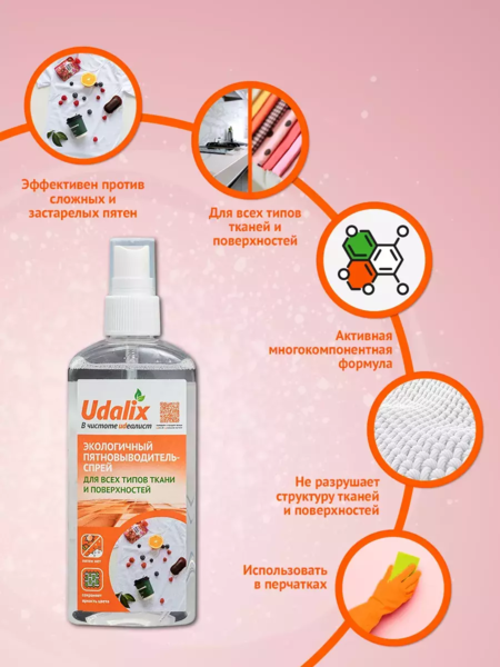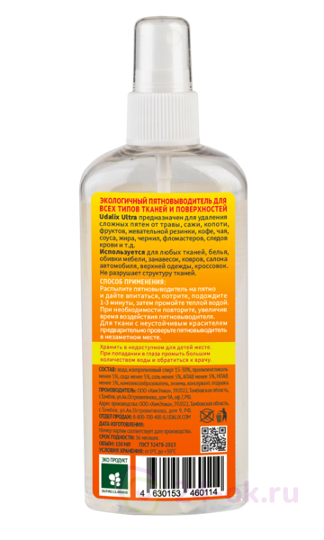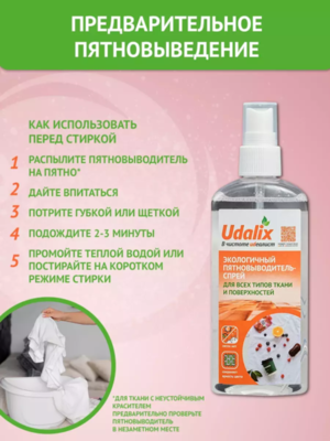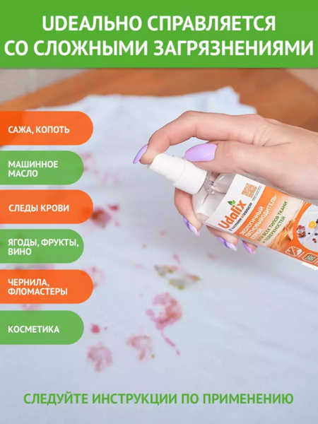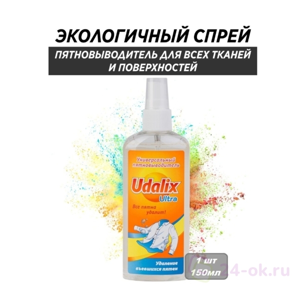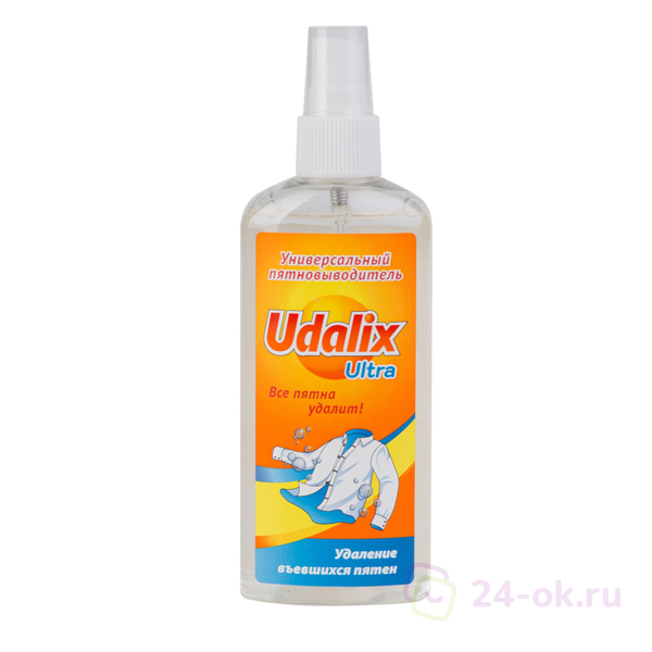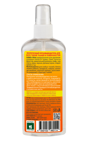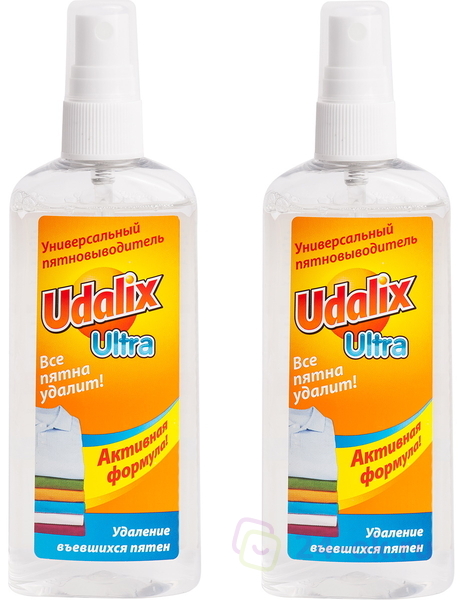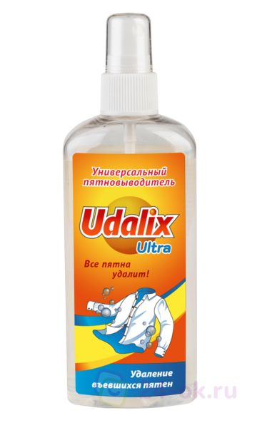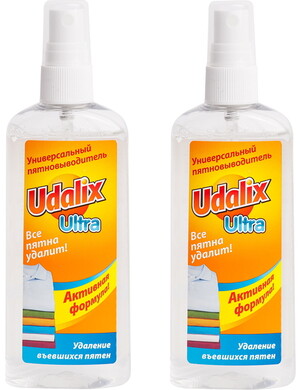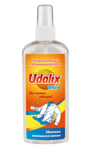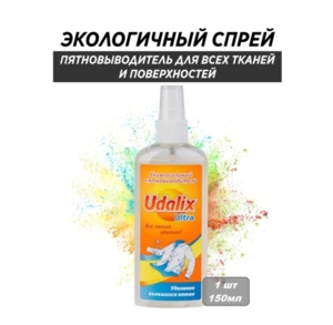 Пятновыводитель Udalix "Ultra", 150 мл - пятновыводитель для удаления сложных пятен с любых тканей и поверхностей. Предназначен для удаления пятен от травы, фруктов, кофе, чая, соуса, сажи, жира, копоти, жевательной резинки, фломастеров, чернил, следов крови и т. д. Используется для любых видов тканей, белья, занавесок, обивки мебели, кроссовок, салона автомобиля, верхней одежды, ковров. Не изменяет и не разрушает структуру ткани. Способ применения: Для ткани с неустойчивым красителем предварительно проверьте пятновыводитель в незаметном месте. Распылите пятновыводитель на пятно и дайте впитаться, подождите 1-3 мин. При въевшихся и сложных пятнах рекомендуется слегка потереть, затем промыть теплой водой. При необходимости повторите, увеличив время воздействия пятновыводителя.