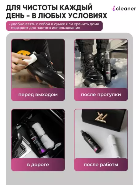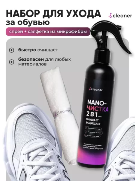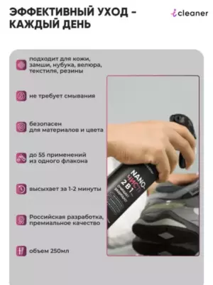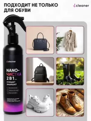 Легкая и сверхэффективная очистка обуви от различных бытовых загрязнений. За 1-2 минуты без применения воды она бережно и деликатно очищает обувь и придает защитные свойства. Обновляет цвет и текстуру материала. Теперь не нужно покупать множество разных средств для очистки каждого вида материала обуви! Nano-Чистка подходит абсолютно для всех материалов: все виды кожи, замша, нубук, велюр, текстиль, резина и др.. Применять для очистки легких и средних загрязнений: пыль, грязь, налет, следы слякоти, остатки пищи и т.п. Преимущества: 1. Экономит время: очистка 1 пары обуви за 1-2 мин; 2. Время высыхания: моментально; 3. Расход: 1 флакона хватит до 55 раз; 4. Приятный запах и не пачкает руки; 5. Экологически чистое и биоразлагаемое; 6. Всесезонное применение. Инструкция: 1. Распылить 2. Протереть сухой тряпочкой 3. Повторить при необходимости. *-неприменять, в случаях, когда требуется глубокая химическая очистка, стирка, реставрация, покраска и т.п.