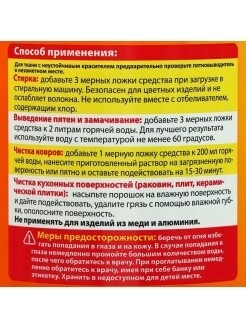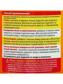 ИНСТРУКЦИЯ: Удаляет трудновыводимые пятна с одежды, белья, обивки мебели, салона автомобиля, ковров, линолеума. Может использоваться как для предварительного замачивания белья, так и для стирки вместе со стиральным порошком для максимального удаления сложных пятен. Отбеливает белое бельё, сохраняет и освежает краски цветного, нейтрализует запахи и придаёт свежесть, бережно сохраняет структуру ткани.
