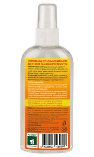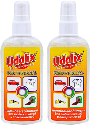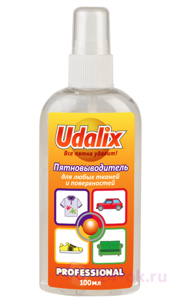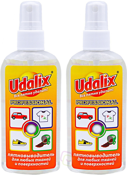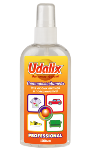 Udalix Professional - предназначен для удаления пятен от шариковых ручек, вина, травы фруктов, кофе, чая, соуса, сажи, жира, копоти, жевательной резинки, фломастеров, чернил и т. д. Используется для любых видов тканей, занавесок, белья, обивки мебели, салона автомобиля, верхней одежды.