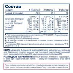 Состав: магния хелат (бисглицинат), микрокристаллическая целлюлоза (носитель), цинка хелат (бисглицинат), желатин, магниевая соль стеариновой кислоты (антислеживающий агент), холекальциферол (витамин D3), пиридоксина гидрохлорид (витамин В6).