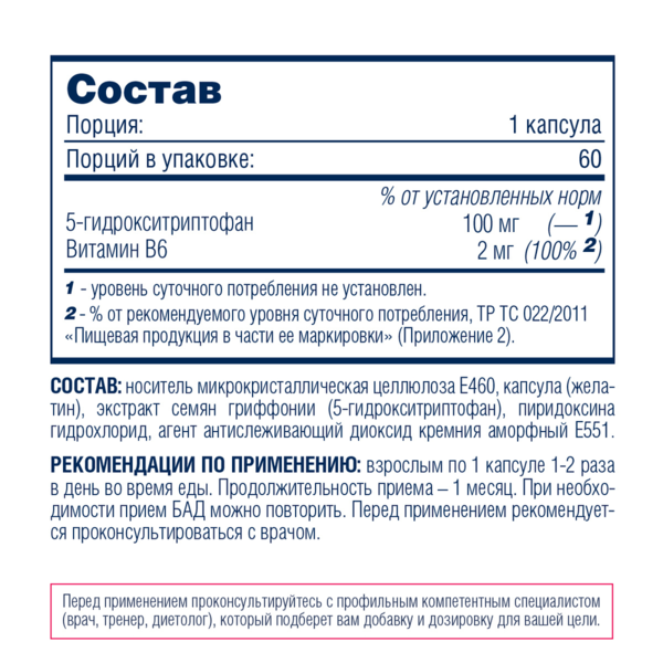 Состав: микрокристаллическая целлюлоза (носитель), 5-гидрокситриптофан (из экстракта семян гриффонии простолистной), капсула (желатин), пиридоксина гидрохлорид, диоксид кремния аморфный (антислеживающий агент).