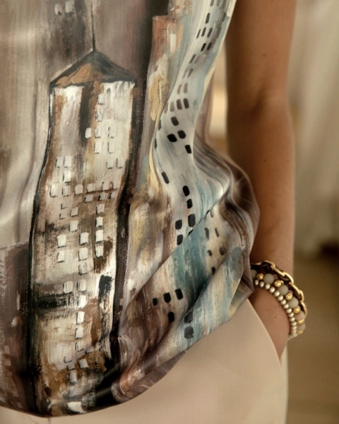 Спереди туника с принтом сделана из атласного шелка, который имеет благородный блеск. Спинка изделия - из эластичного трикотажа, который компенсирует то, что шёлк не тянущийся материал, и обеспечивает хорошую посадку.