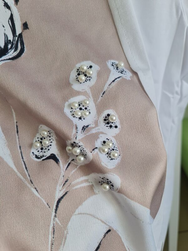 Особенность нашей новинки - нежнейший цветок тюльпана из органзы, изящно дополняющий авторский рисунок от наших художников. Ещё одна изюминка данной модели - жемчужные бусины, лаконично располагающиеся на бутонах отрисованных цветов. Шелк элегантно переливается и прекрасно сочетается с матовым хлопком.