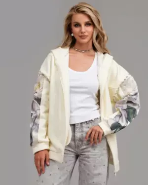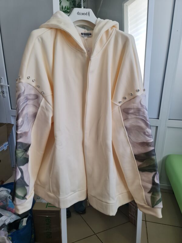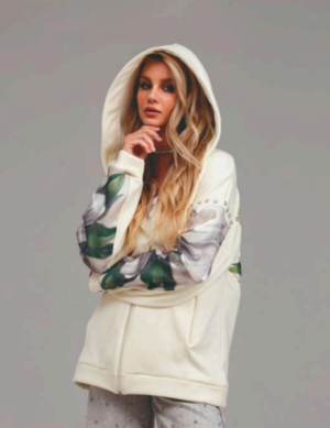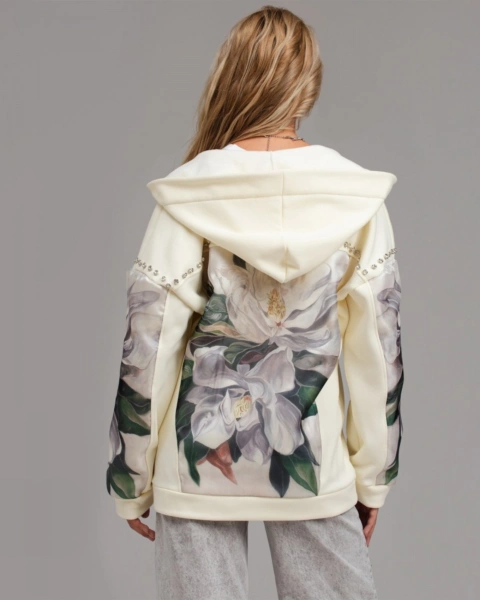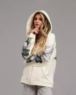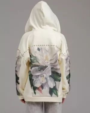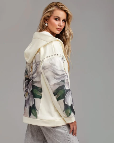 Толстовка женская с органзой - очень стильная и необычная вещь, которая станет изюминкой вашего гардероба. Идеально подойдет как к спортивному повседневному, так и к нарядному образу. Благодаря вставкам из органзы на рукавах и спине и заклепкам-кристаллам, толстовка выглядит очень необычно и красиво. Вы сможете создать множество модных образов с этим изделием. Капюшон и боковые карманы делают толстовку очень удобной и комфортной. Спущенная линия плеча и оверсайз крой позволяет изделию идеально сидеть на любой фигуре. Необычный принт на спине точно привлечет внимание к вашему образу, а толстовка станет любимой вещью в гардеробе.