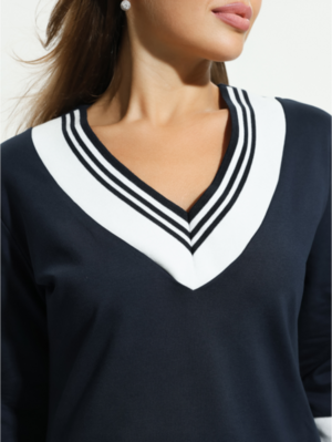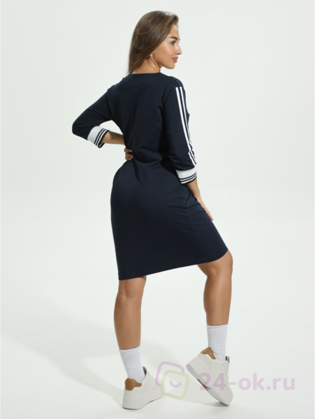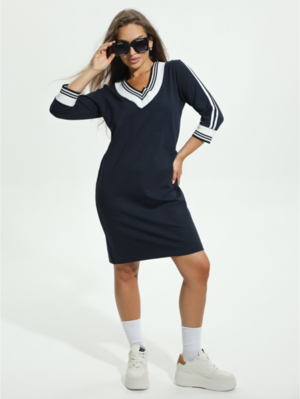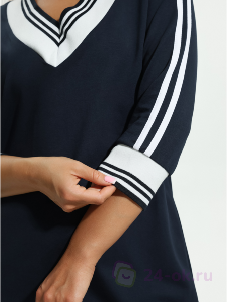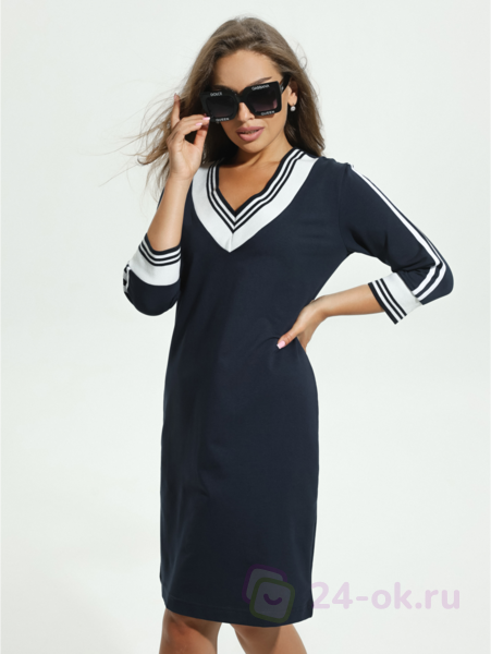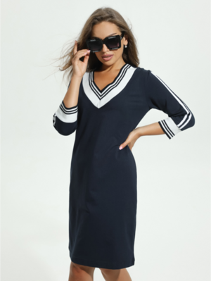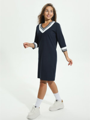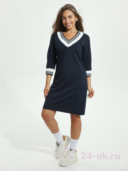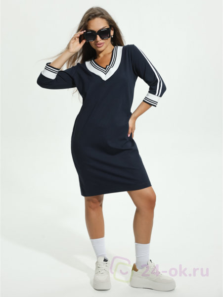 Ряд: 44-58, Состав: 95% х/б; 5% лайкра, Ткань: футер двунитка с лайкрой Пенье, Цвет: синий Описание Повседневное женское платье спортивного типа выполнено из футера двунитки. Обработка манжетов и горловины защищает края от деформации. Широкий V-образный вырез визуально удлиняет шею, а контрастная лента на горловине и рукавах привлекает внимание к лицу и зоне декольте. Полотно отлично впитывает влагу, дышит, не электризуется и мало мнётся. Благодаря лайкре в составе, оно хорошо растягивается и также легко возвращает форму. Длина оптимальная как для активного отдыха, так и для спокойных прогулок, мероприятий и даже свиданий. В таком платье вашей коже будет комфортно, как в летний период, так и в холодное время года, дополнив стильное платье теплым кардиганом.