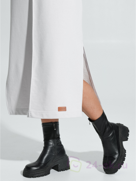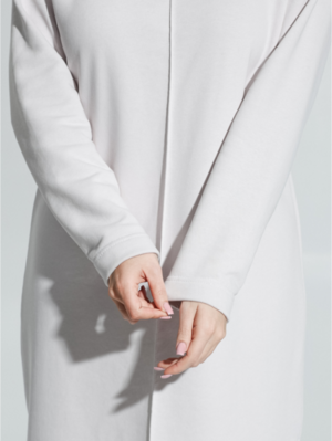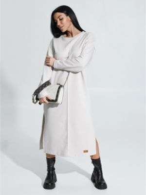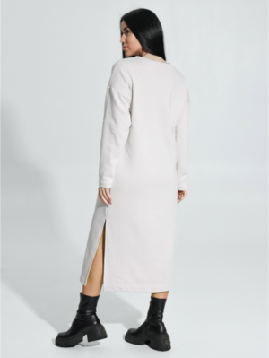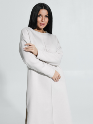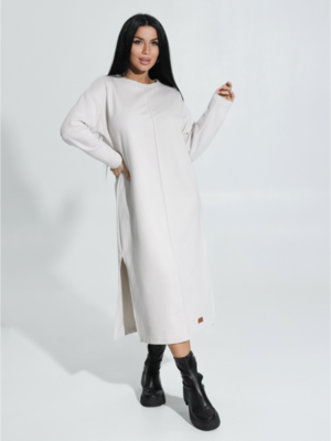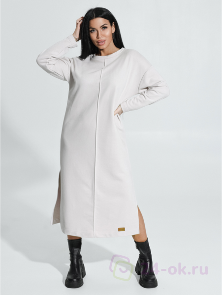 Ряд: 46-56, Состав: 70% х/б; 30% п/э, Ткань: футер трехнитка петля, Цвет: бежевый Описание Платье прямого силуэта со спущенным плечом и длинным втачным рукавом. На полочке по средней линии проложена отделочная строчка на 0,2см.