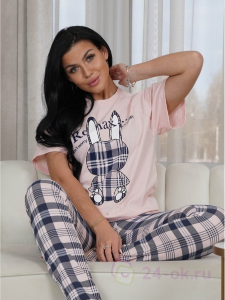 Ряд: 44-58, Состав: 60% х/б; 40% п/э, Ткань: кулирка, Цвет: клетка Описание Красивый домашний костюм женский из трикотажа высокого качества. Костюм состоит из прямых длинных слегка зауженных пижамных штанов в клетку с карманами и футболки с коротким рукавом с интересным принтом. Широкий круглый вырез футболки создает ощущение комфорта и воздушности, при этом вы не будете чувствовать себя стесненными, а резинка на поясе брюк обеспечивает плотную и удобную посадку, они не сползают вниз и не заставят чувствовать дискомфорт. Мягкая на ощупь ткань в сочетании с дышащими материалами обеспечивает спокойный отдых. Выбирайте деликатный способ стирки при температуре до 30 градусов, и тогда вы сможете долго наслаждаться качеством нашей модели.