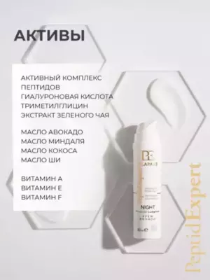 Входящий в состав крема комплекс пептидов Matrixyl 3000 активно борется с морщинами, усиливая естественные процессы регенерации кожи, а входящие в состав крема гиалуроновая кислота, масла и витамины обеспечивают ей полноценное питание и увлажнение, прекрасно дополняя дневной уход.