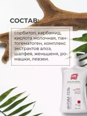 мягко очищает кожу обеспечивает ощущение чистоты и свежесть в течение всего дня легко смывается поддерживает естественные защитные функции кожи Мягкая натуральная формула геля специально разработана для ежедневного ухода за самыми нежными интимными зонами. В состав геля входит молочная кислота, которая способствует поддержанию естественного баланса (рН) интимной зоны. Способ применения: небольшое количество геля нанести на деликатные участки тела, вспенить, тщательно смыть водой. Рекомендуется в качестве гигиенического моющего средства для женщин и мужчин. Без лаурилсульфата натрия. Без спирта. Без парабенов. Без синтетических красителей. Без продуктов нефтепереработки Активные компоненты: сорбитол, карбамид, кислота молочная, пантогематоген, комплекс экстрактов алоэ, шалфея, женьшеня, ромашки, лимонника. Экстракт шалфея нормализует функцию сальных желез, дезинфицирует, предохраняет от обезжиривания, уменьшает потоотделение. Экстракт женьшеня обладает удерживающим влагу, тонизирующим, тканеукрепляющим действиями. Экстракт ромашки имеет выраженный противовоспалительный, антисептический, смягчающий эффекты. Объем: 360 мл Срок годности: 18 месяцев