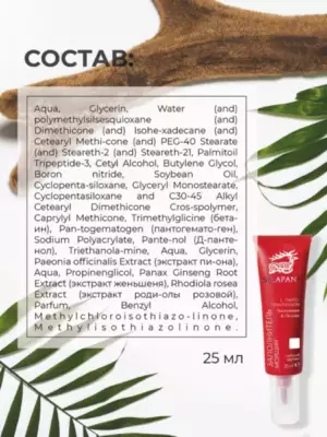 Инновационное сочетание антивозрастных компонентов и светоотражающих частиц позволяет не только бережно ухаживать за кожей и скрывать эстетические несовершенства, но и стимулировать выработку собственного коллагена, который отвечает за регенерацию, упругость и молодость кожи. скрывает эстетические несовершенства (расширенные поры, мелкие морщинки, неровный рельеф кожи) стимулирует выработку собственного коллагена, который отвечает за регенерацию, упругость и молодость кожи уменьшает видимые признаки возрастных изменений кожи обладает выравнивающим и матирующим эффектами улучшает эластичность и плотность кожи, уменьшает морщины, сокращает поры Способ применения: нанести заполнитель морщин точечно на морщины или на все лицо после использования крема и сыворотки или на очищенную кожу. Активные компоненты: бетаин, пантогематоген, Д-пантенол, экстракты пиона, женьшеня, родиолы розовой. Объем: 25 мл