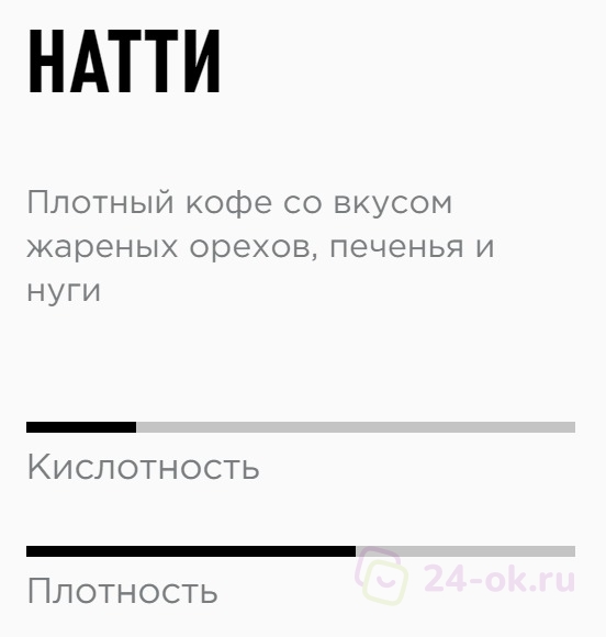 Плотный кофе со вкусом жареных орехов, печенья и нуги.