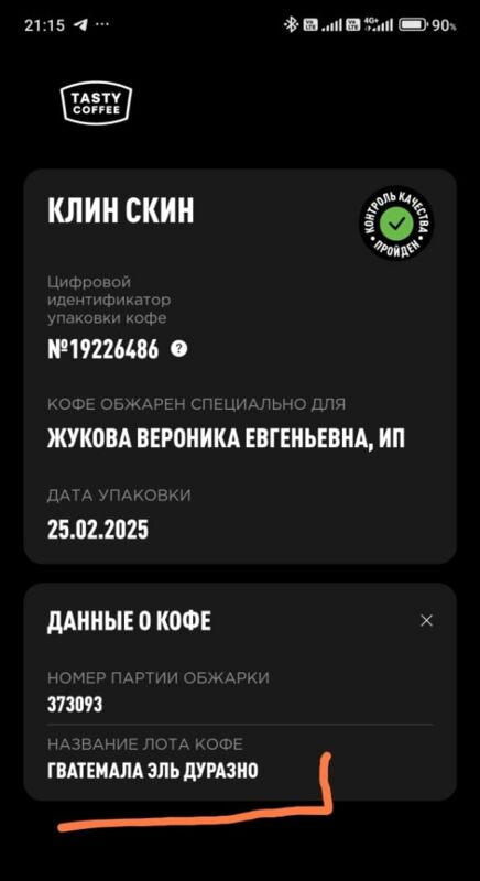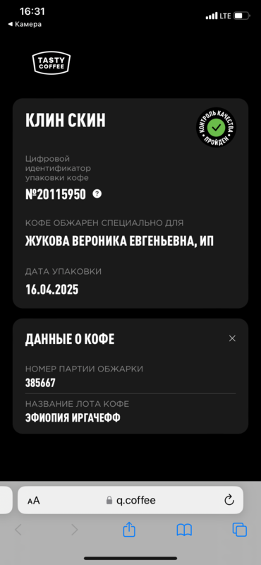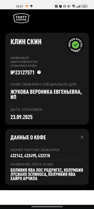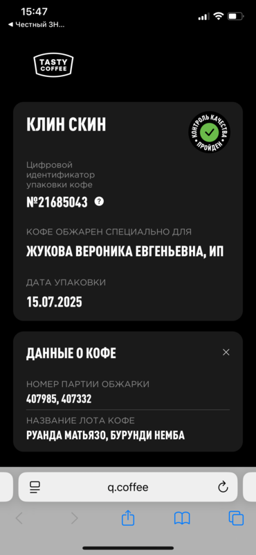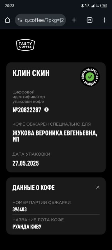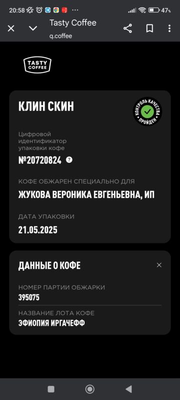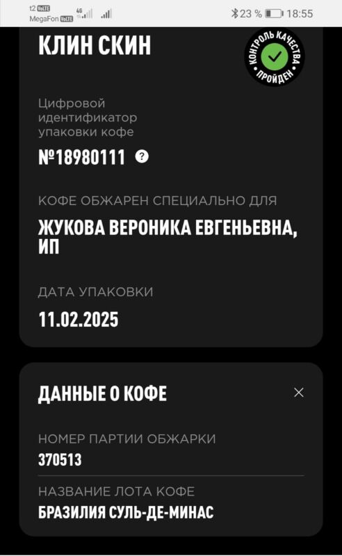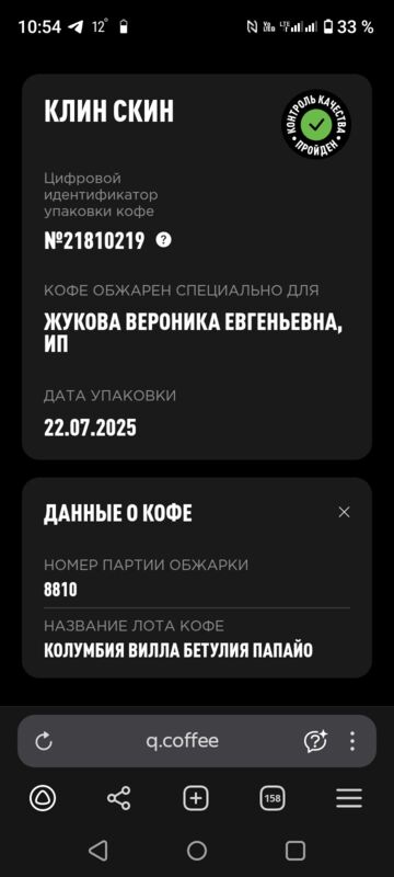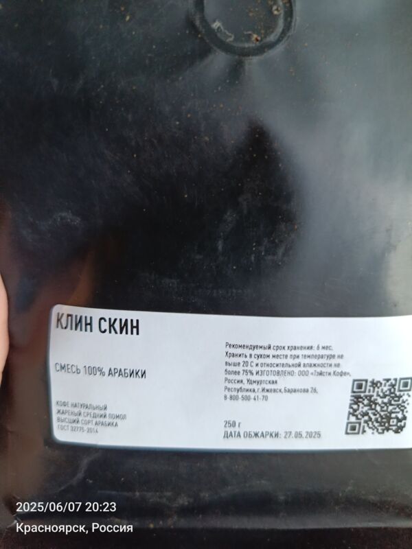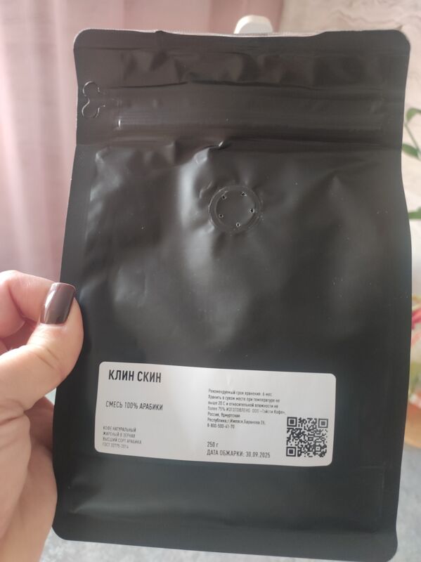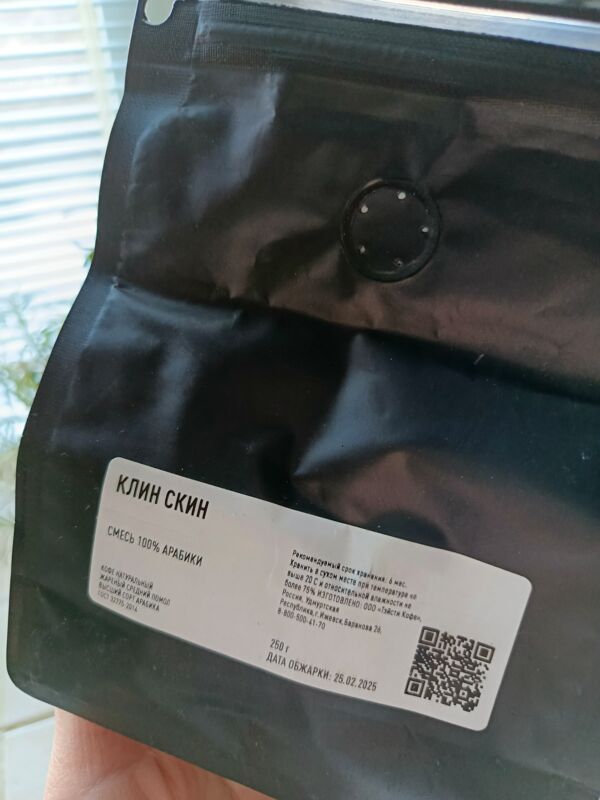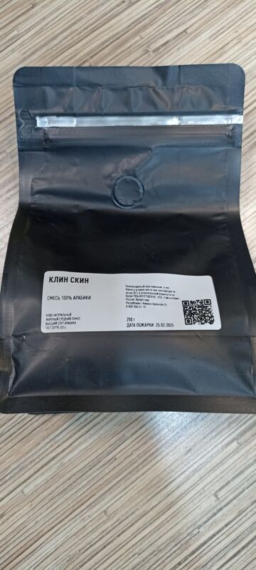 Если отсканировать QR-код н нашей фирменной пачке — он перейдет на сайт интернет-магазина. Клин Скин упаковывается в небрендированные пачки, если отсканировать QR-код — перейдет на сайт q.coffee, куда загружаются данные об обжарке партии. PG-0381 — это номер лота. Также там можно посмотреть состав смеси."