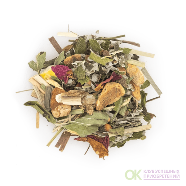 Тизан с имбирём, лемонграссом, ромашкой, яблоком, чёрным перцем, розой, лимоном, корицей, мятой.
