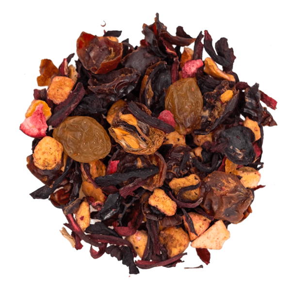 Тизан на основе гибискуса с изюмом, кусочками яблок, вишни, малины, шиповника, можжевельника и миксом из жёлтых и оранжевых цукатов