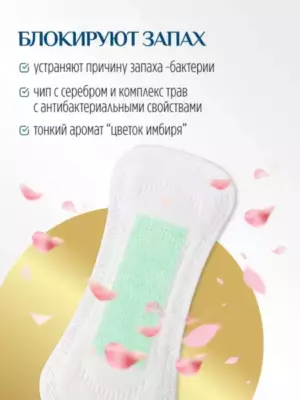 В составе анионовый чип с наносеребром для антибактериальной защиты. Экстракты лечебных трав: полыни, белого пиона, софоры и чайные полифенолы, имеют противовоспалительное действие и поддерживают баланс микрофлоры. Ежедневки с анионами и турмалином нейтрализуют нежелательные запахи и обладают ароматом цветка имбиря.
