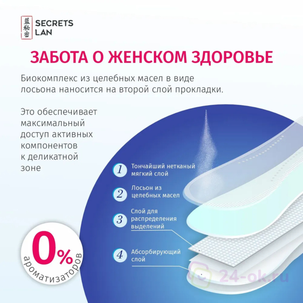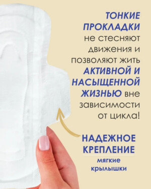 Мягкая хлопковая поверхность и анатомическая форма дарят ощущение комфорта и свободу движений. Прокладки обеспечивают более высокую степень впитывания жидкости для максимальной уверенности при обильных выделениях. Двойные удобные крылышки и барьерные линии защиты предупреждают протекание. Растительные компоненты оказывают противовоспалительное действие, препятствуют появлению неприятного запаха, защищают кожу от раздражений. Масло гвоздичного дерева обладает противомикробным и антисептическим действием, сезамовое (кунжутное) масло смягчает кожу и способствует сохранению её барьерных функций. Масло семян лотоса придает коже дополнительные защитные свойства. Прокладки изготовлены без использования химических ароматизаторов и других вредных для кожи ингредиентов. Противопоказания: беременность, индивидуальная непереносимость компонентов. Не являются лечебными.