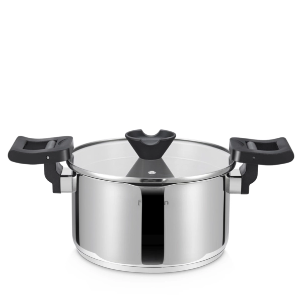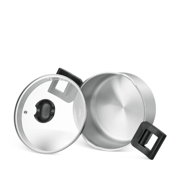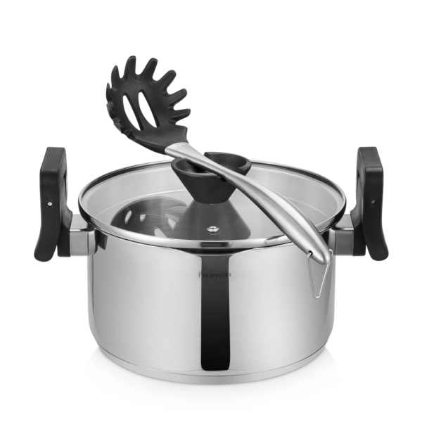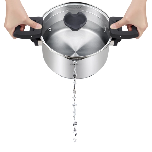 Уникальная разработка FISSMAN – кастрюля со складными бакелитовыми ручками! Они не только экономят пространство при хранении, а также служат прихваткой, удобно сливать лишнюю жидкость. Ручку на крышке можно использовать как подставку для кухонных принадлежностей.