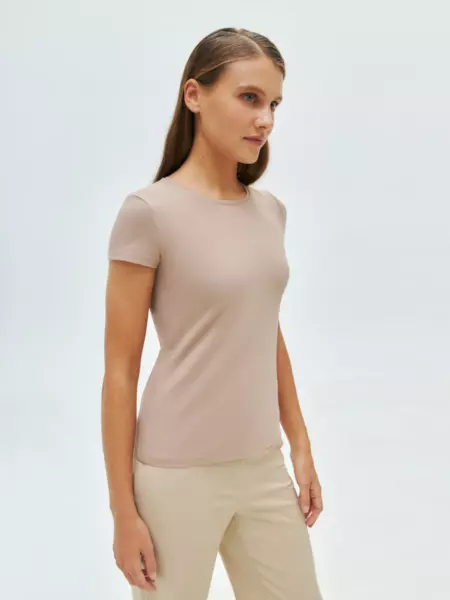 95%хлопок 5%эластан Лаконичная приталенная футболка с коротким рукавом базового оттенка легко впишется в любой стиль: от делового дресс-кода до экстравагантного китча. Приталенный силуэт подчеркивает нежные женственные изгибы, классический круглый вырез делает акцент на лице и шее. Соберите стильный образ в теплой песочной гамме: дополните футболку джинсами, юбкой или брюками из наших коллекций. -натуральный хлопковый трикотаж; -приталенный силуэт; -короткие рукава; -круглый вырез. Лаконичная приталенная футболка с коротким рукавом базового оттенка легко впишется в любой стиль: от делового дресс-кода до экстравагантного китча. Приталенный силуэт подчеркивает нежные женственные изгибы, классический круглый вырез делает акцент на лице и шее. Соберите стильный образ в теплой песочной гамме: дополните футболку джинсами, юбкой или брюками из наших коллекций. -натуральный хлопковый трикотаж; -приталенный силуэт; -короткие рукава; -круглый вырез.