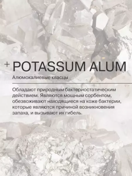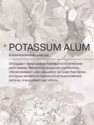 - алюмо-калиевые квасцы - мощный сорбент, обезвоживает находящиеся на коже бактерии-причину возникновения запаха, и вызывает их гибель