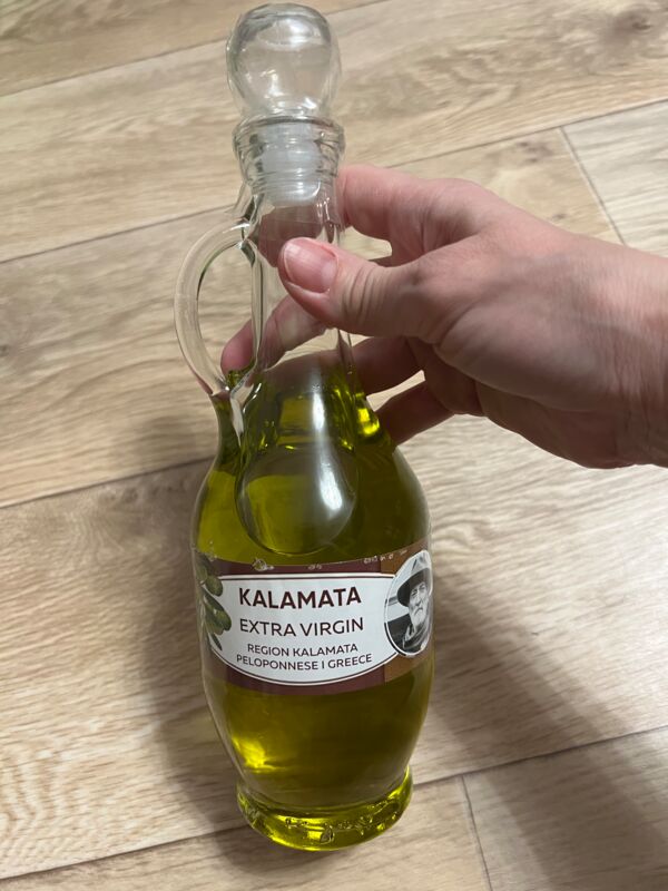 •Kalamata extra virgin свежих оливок путём механического отжима без применения химических растворителей или термической обработки. •Ключевые характеристики: Кислотность: не более 0,8 %. Это показатель качества масла, который указывает на количество свободных жирных кислот в масле. Чем ниже кислотность, тем выше качество масла. • Вкус и аромат: свежий, фруктовый, с лёгкой горчинкой. • Цвет: от светло-жёлтого до золотисто-зелёного. Оливковое масло extra virgin широко используется в кулинарии для приготовления различных блюд, а также в косметических целях благодаря своим полезным свойствам.