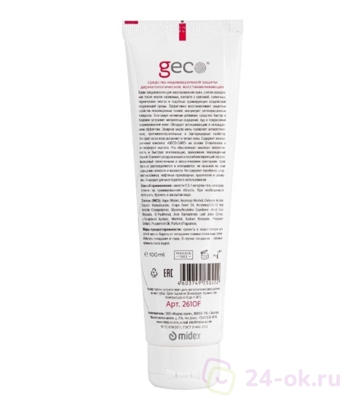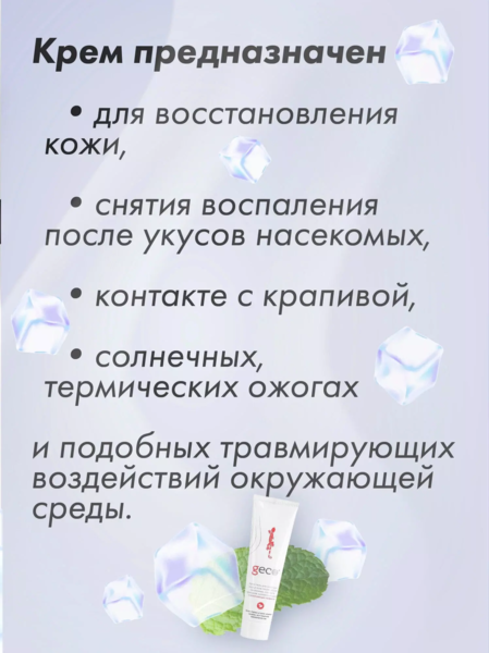 Крем предназначен для восстановления кожи, снятия воспаления после укусов насекомых, контакте с крапивой, солнечных, термических ожогах и подобных травмирующих воздействий окружающей среды. Эффективно восстанавливает защитные свойства поврежденных тканей, инициирует регенерационные процессы. Благодаря активным добавкам, средство быстро и бережно устраняет неприятные ощущения, зуд и покраснение травмированной кожи. Обладает успокаивающим и охлаждающим эффектом. Эфирное масло мяты проявляет антисептические, противовоспалительные и бактерицидные свойства. Экстракт алоэ вера увлажняет и питает кожу. Содержит инновационный комплекс «GECO-CARE» на основе d-пантенола и α-токоферол ацетата. Что обеспечивает высокую эффективность и быструю эпителизацию, заживление повреждённых тканей. Снижает раздражающий и сенсибилизирующий эффект, вызванный техногенными и экологическими факторами. Крем хорошо распределяется и впитывается, не вызывая на коже ощущения липкости и жирности. Не содержит парабенов, хлоризотиазолинов, нефтяных производных, красителей и силиконов. Подходит для многократного использования.