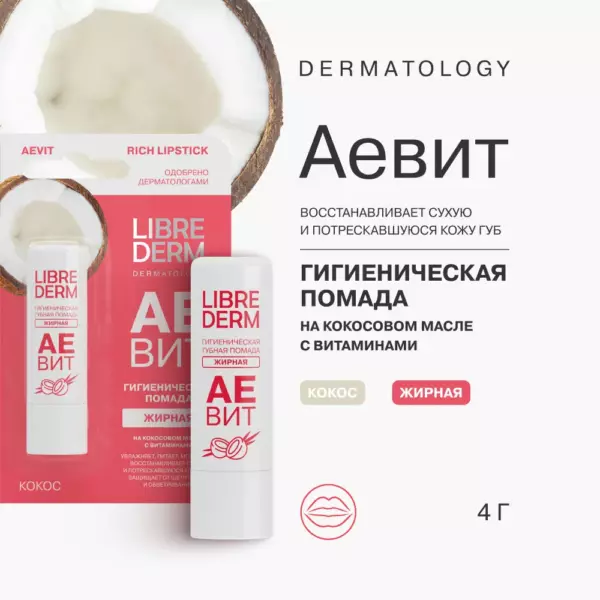 LIBREDERM АЕВИТ гигиеническая губная помада жирная Кокос 4 г