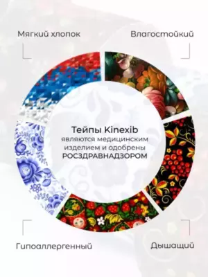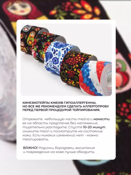 А ты готов раздавать русский стиль? Ягода - малинка, белая березонька, матрешки - все, что так дорого сердцу русского человека мы воплотили в новых принтах "Культурный код". Народный промысел и узнаваемые всеми узоры теперь на тейпах Kinexib.Classic – серия гипоаллергенных хлопковых кинезио тейпов средней фиксации с японской клеевой основой. Применяются при повседневных и легких физических нагрузках. Подходит для лица и для детей. Влагостойкие, держатся 3-5 дней. Бумажная подложка с разметкой для удобства нарезки.