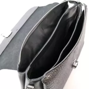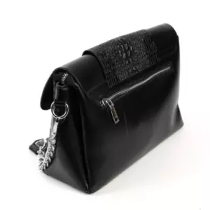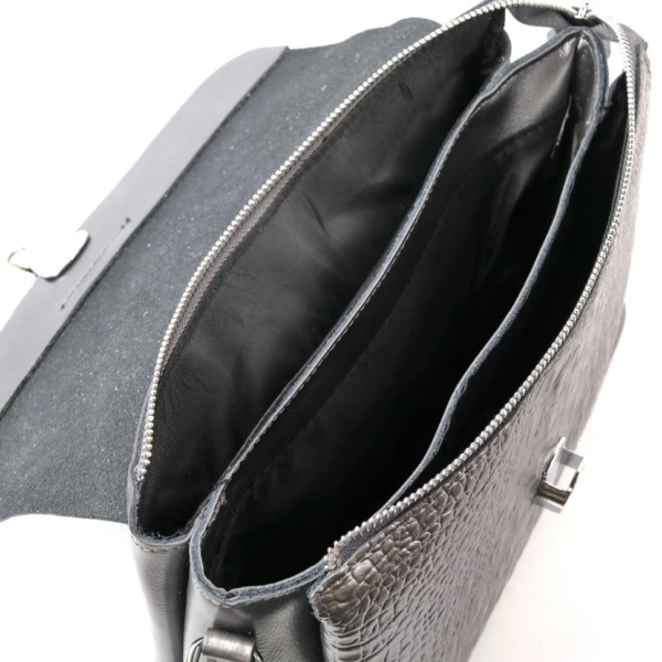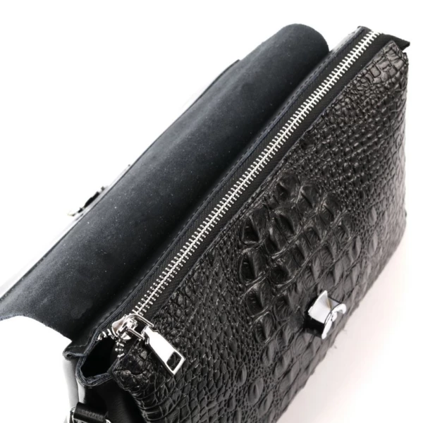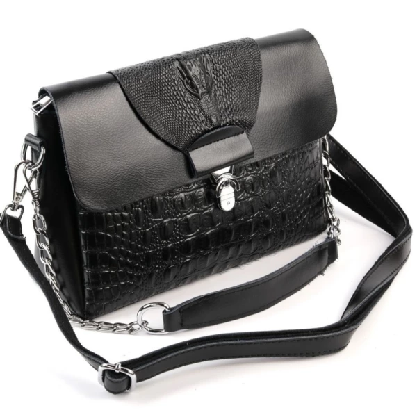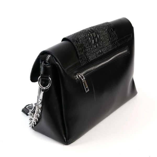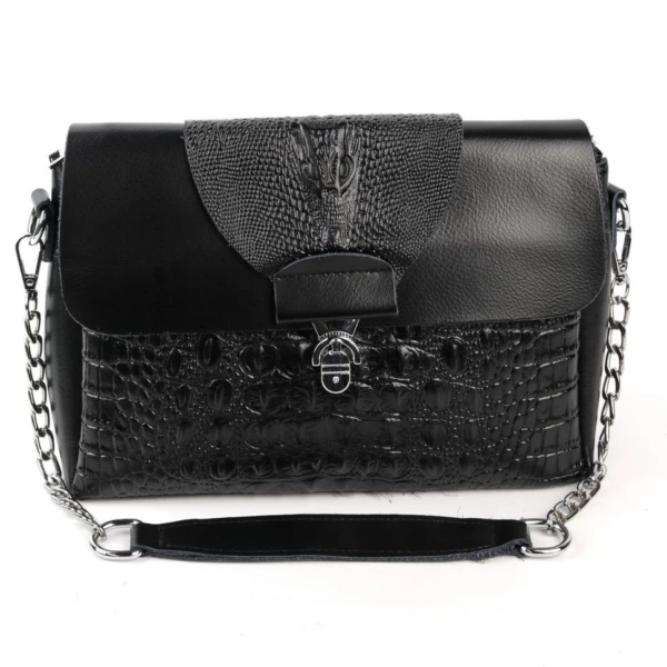 Женская сумка из натуральной гладкой кожи и кожи под крокодила черного цвета. Закрывается на клапан с рамочным замком и на молнию. Внутри три отделения и боковые кармашки, один на молнии и два открытых. Снаружи, на обратной стороне карман на молнии. В комплекте короткий ремешок с цепочкой, длиной 55 см., и регулируемый по длине наплечный ремень, с максимальной длиной 130 см.
