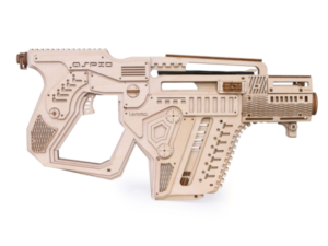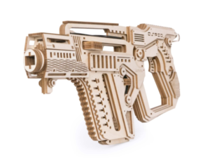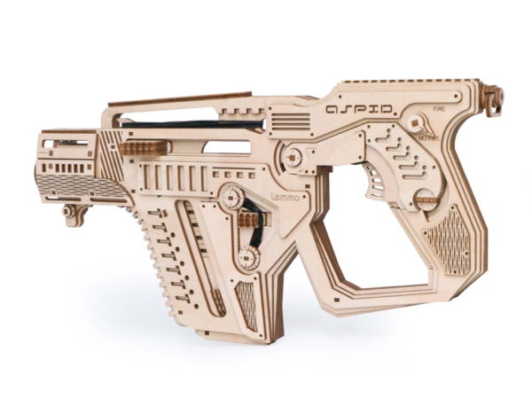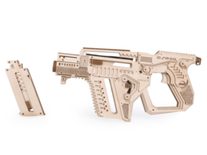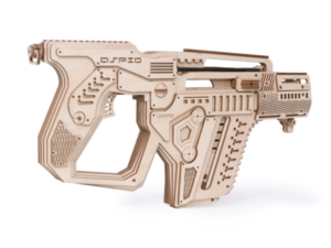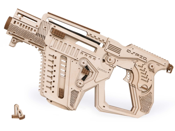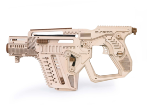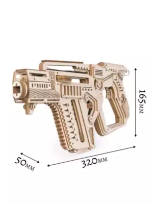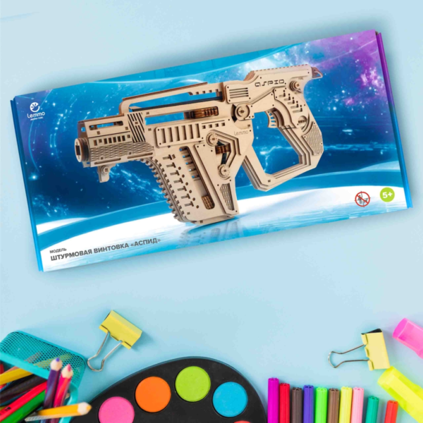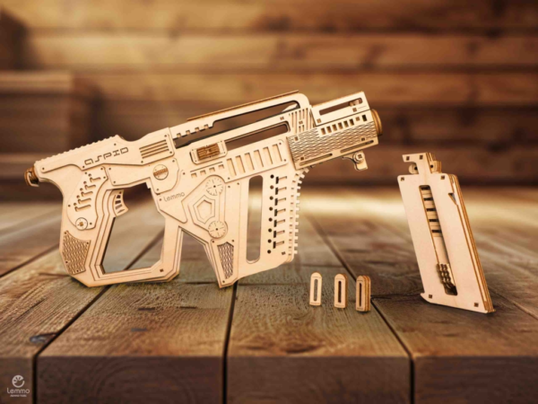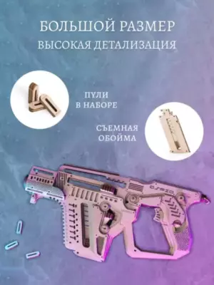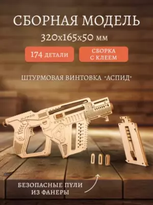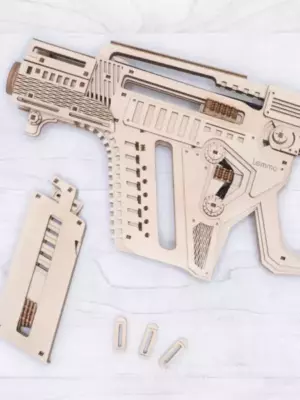 Собранная модель заряжается и стреляет пулями из фанеры. Дальность стрельбы до 6 м. У винтовки достается обойма и возможна замена резинок в механизмах. При желании игрушку можно раскрасить акриловыми красками.