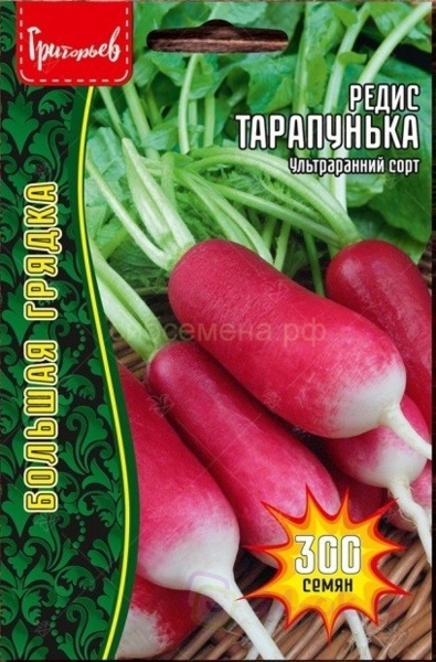 Редис Тарапунька – ультраранний (16-20 дней от всходов до технической спелости) сорт. Цвет корнеплода варьируется от розовато-красного до ярко- красного с белым кончиком. Форма – овально-цилиндрическая. Длина корнеплода достигает 8 см. Вес плода составляет 20-25 г. На одном участке земли за весенне-летний сезон можно получить до 4 урожаев этого корнеплода. Первый посев осуществляется сразу, как только сходит снег. Последующие – с интервалом не менее 2 недель. Последний посев производят в середине августа. Редис 18 дней характеризуется хорошей лежкостью. Для зимнего хранения подходят корнеплоды, выращенные с середины августа до конца сентября