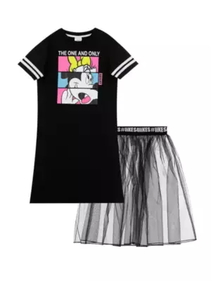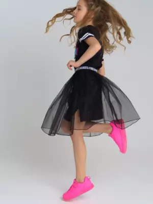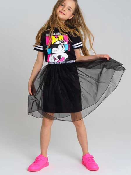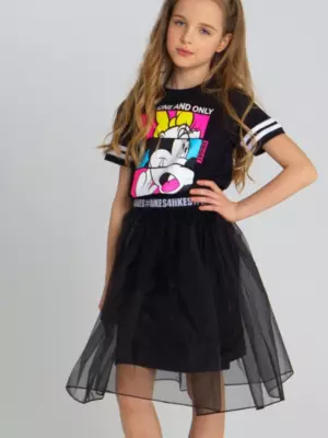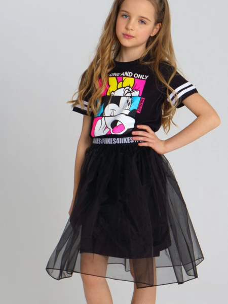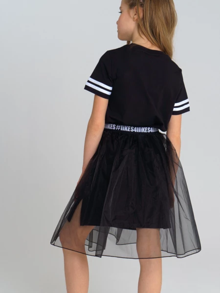 Комплект: платье трикотажное и юбка из органзы. Размер изделия на фото - 140, параметры модели (см): рост 141, обхват груди-талии-бедер: 61-56-70. Высокое содержание хлопка 95%. Благодаря наличию эластана в составе ткани, изделие проще в уходе и держит форму. Юбка из органзы на декоративной жаккардовой резинке.